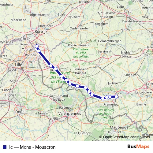 The first stop of the Ic rail route is Mouscron / Moeskroen and the last stop is Mons / Bergen. Ic (Mons - Mouscron) is operational during on weekends.