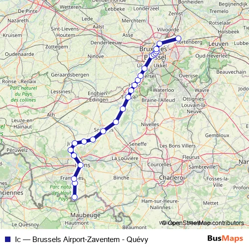The first stop of the Ic rail route is Quévy and the last stop is Brussels Airport-Zaventem. Ic (Brussels Airport-Zaventem - Quévy) is operational during on weekdays.