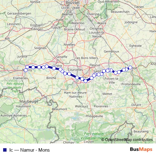 The first stop of the Ic rail route is Namur / Namen and the last stop is Mons / Bergen. Ic (Namur - Mons) is operational during on weekdays.