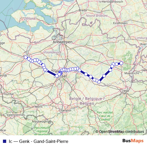 The first stop of the Ic rail route is Genk and the last stop is Gand-Saint-Pierre / Gent-Sint-Pieters. Ic (Genk - Gand-Saint-Pierre) is operational during on weekdays.