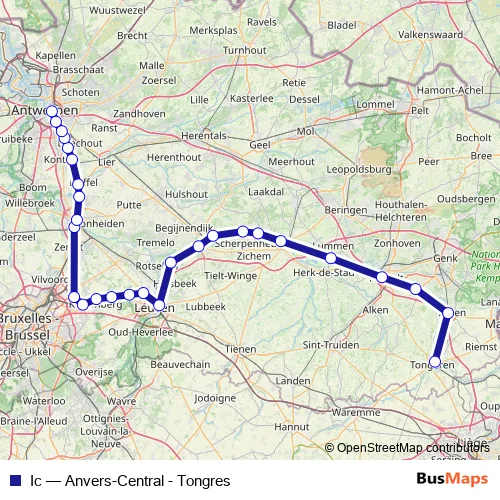 The first stop of the Ic rail route is Tongres / Tongeren and the last stop is Anvers-Central / Antwerpen-Centraal. Ic (Anvers-Central - Tongres) is operational during on weekdays.