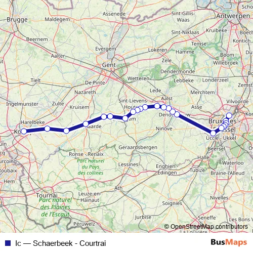 The first stop of the Ic rail route is Schaerbeek / Schaarbeek and the last stop is Courtrai / Kortrijk. Ic (Schaerbeek - Courtrai) is operational during on weekdays.