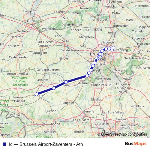 The first stop of the Ic rail route is Ath / Aat and the last stop is Brussels Airport-Zaventem. Ic (Brussels Airport-Zaventem - Ath) is operational during on weekends.