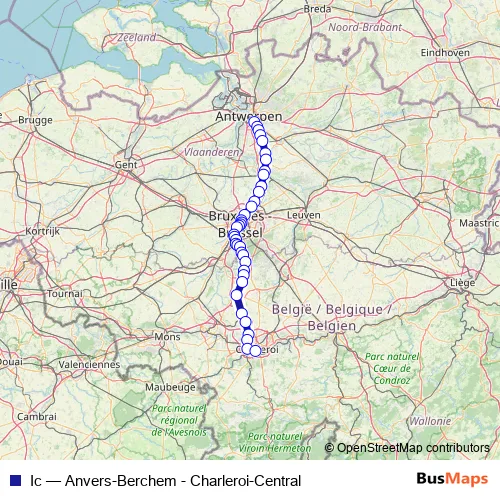 The first stop of the Ic rail route is Anvers-Berchem / Antwerpen-Berchem and the last stop is Charleroi-Central. Ic (Anvers-Berchem - Charleroi-Central) is operational during on weekends.