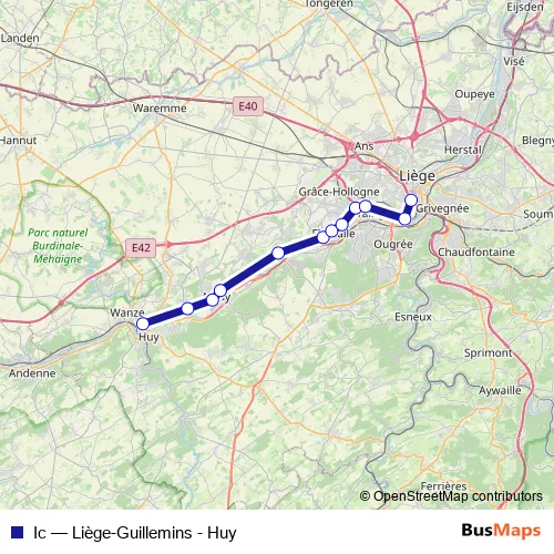 The first stop of the Ic rail route is Huy / Hoei and the last stop is Liège-Guillemins / Luik-Guillemins. Ic (Liège-Guillemins - Huy) is operational during on weekends.