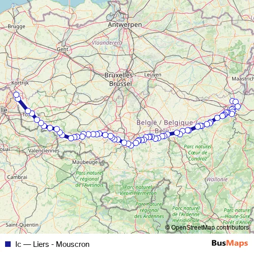 The first stop of the Ic rail route is Liers and the last stop is Mouscron / Moeskroen. Ic (Liers - Mouscron) is operational during on weekends.