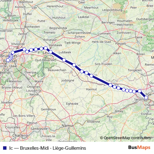 The first stop of the Ic rail route is Liège-Guillemins / Luik-Guillemins and the last stop is Brux.-Midi/Brus.-Zuid. Ic (Bruxelles-Midi - Liège-Guillemins) is operational during everyday.