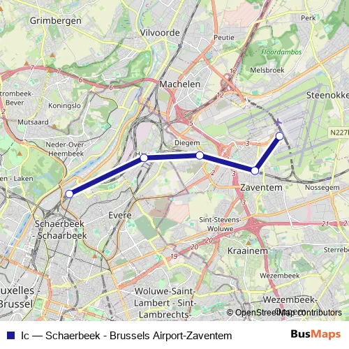 The first stop of the Ic rail route is Brussels Airport-Zaventem and the last stop is Schaerbeek / Schaarbeek. Ic (Schaerbeek - Brussels Airport-Zaventem) is operational during everyday.