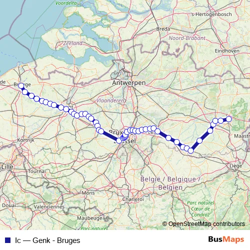 The first stop of the Ic rail route is Bruges / Brugge and the last stop is Genk. Ic (Genk - Bruges) is operational during on weekends.