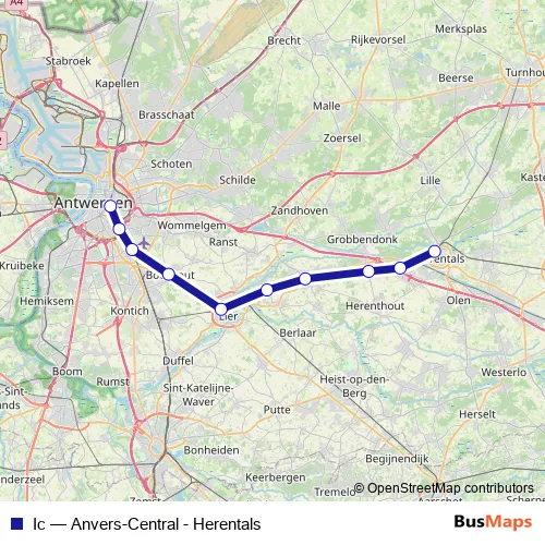 The first stop of the Ic rail route is Anvers-Central / Antwerpen-Centraal and the last stop is Herentals. Ic (Anvers-Central - Herentals) is operational during everyday.