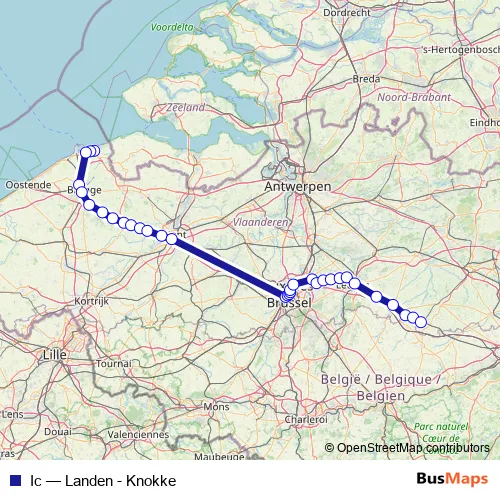 The first stop of the Ic rail route is Knokke and the last stop is Landen. Ic (Landen - Knokke) is operational during on weekdays.