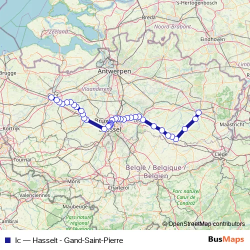 The first stop of the Ic rail route is Hasselt and the last stop is Gand-Saint-Pierre / Gent-Sint-Pieters. Ic (Hasselt - Gand-Saint-Pierre) is operational during everyday.
