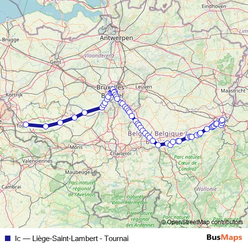 The first stop of the Ic rail route is Tournai / Doornik and the last stop is Liège-Saint-Lambert / Luik-Sint-Lambertus. Ic (Liège-Saint-Lambert - Tournai) is operational during on weekdays.