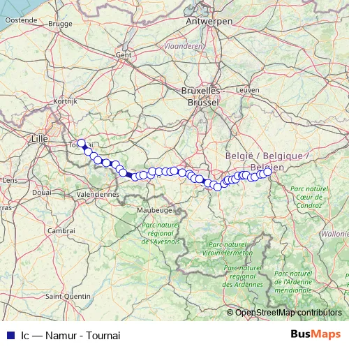 The first stop of the Ic rail route is Tournai / Doornik and the last stop is Namur / Namen. Ic (Namur - Tournai) is operational during on weekdays.