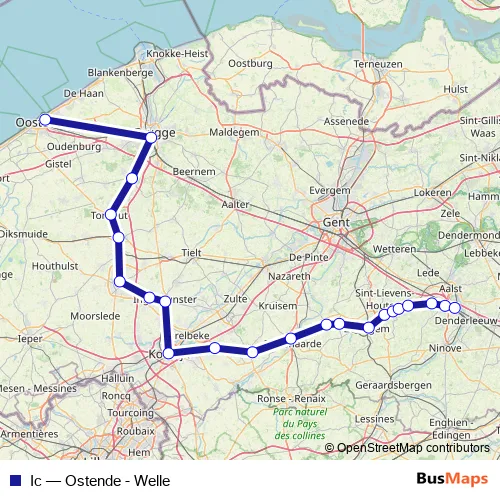 The first stop of the Ic rail route is Ostende / Oostende and the last stop is Welle. Ic (Ostende - Welle) is operational during everyday.