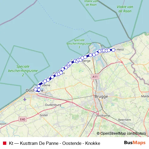 The first stop of the Kt tram route is Oostende Station tramperron 3 and the last stop is Knokke Station Tramperron (aankomst). Kt (Kusttram De Panne - Oostende - Knokke) is operational during everyday.