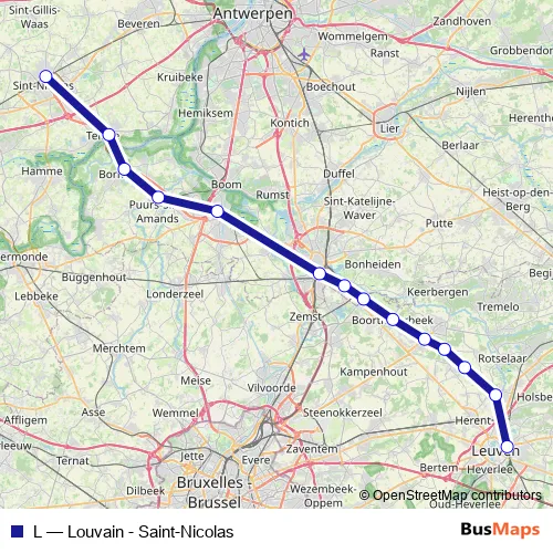 The first stop of the L rail route is Saint-Nicolas / Sint-Niklaas and the last stop is Louvain / Leuven. L (Louvain - Saint-Nicolas) is operational during on weekdays.