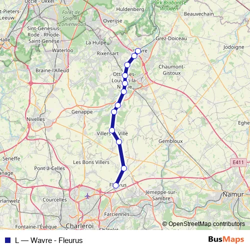 The first stop of the L rail route is Fleurus and the last stop is Wavre / Waver. L (Wavre - Fleurus) is operational during on weekends.