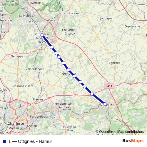 The first stop of the L rail route is Namur / Namen and the last stop is Ottignies. L (Ottignies - Namur) is operational during everyday.