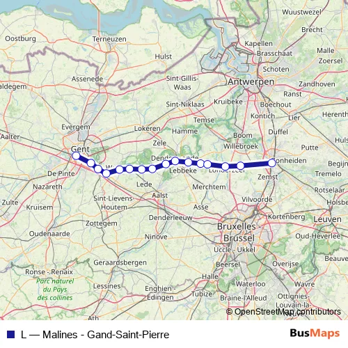 The first stop of the L rail route is Gand-Saint-Pierre / Gent-Sint-Pieters and the last stop is Malines / Mechelen. L (Malines - Gand-Saint-Pierre) is operational during everyday.