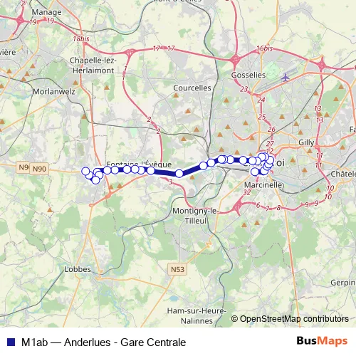 The first stop of the M1ab bus route is Charleroi Gare Centrale - Quai 07 and the last stop is Anderlues Monument. M1ab (Anderlues - Gare Centrale) is operational during everyday.