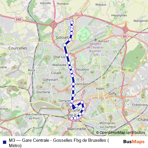The first stop of the M3 metro route is Gosselies Faubourg de Bruxelles (M) and the last stop is Charleroi Gare Centrale - Quai 01 (M). M3 (Gare Centrale - Gosselies Fbg de Bruxelles (Métro)) is operational during everyday.