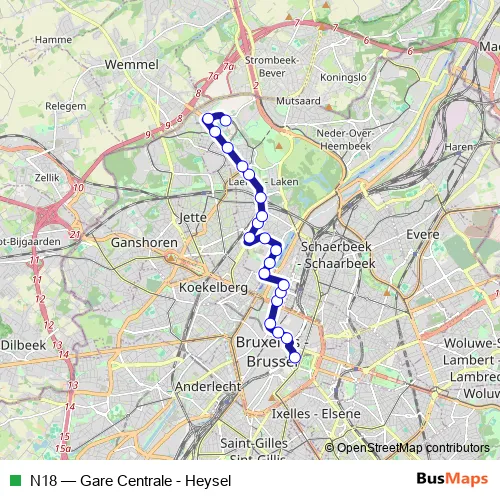 The first stop of the N18 bus route is Gare Centrale and the last stop is Heysel. N18 (Gare Centrale - Heysel) is operational during on weekends.