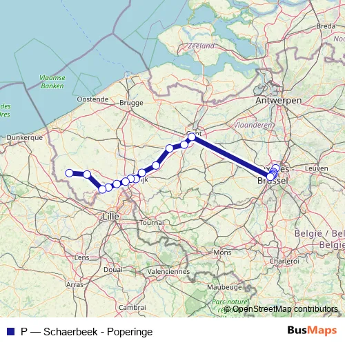 The first stop of the P rail route is Schaerbeek / Schaarbeek and the last stop is Poperinge. P (Schaerbeek - Poperinge) is operational during on weekdays.