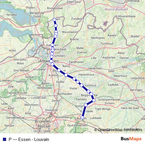 The first stop of the P rail route is Essen and the last stop is Louvain / Leuven. P (Essen - Louvain) is operational during everyday.