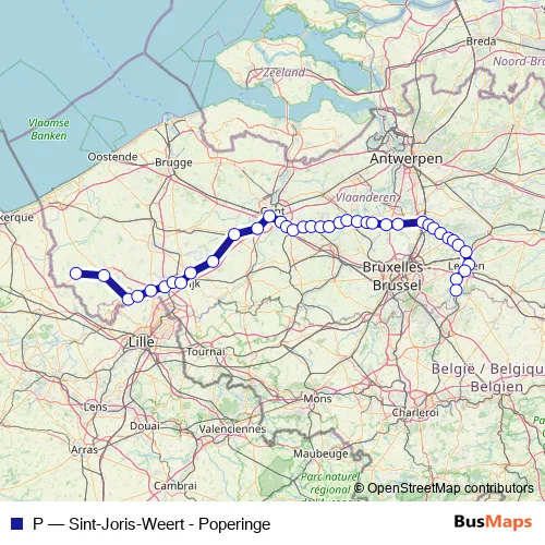 The first stop of the P rail route is Poperinge and the last stop is Sint-Joris-Weert. P (Sint-Joris-Weert - Poperinge) is operational during everyday.