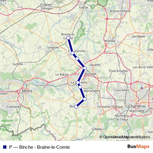 The first stop of the P rail route is Binche and the last stop is Braine-le-Comte / 's-Gravenbrakel. P (Binche - Braine-le-Comte) is operational during on weekdays.