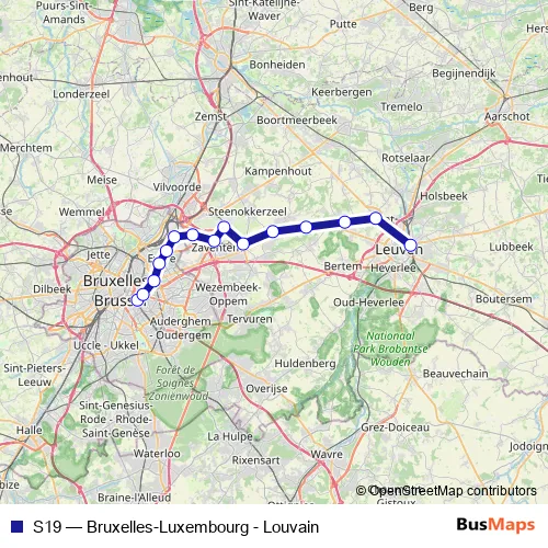 The first stop of the S19 rail route is Brux./Brus.-Luxemb. and the last stop is Louvain / Leuven. S19 (Bruxelles-Luxembourg - Louvain) is operational during on weekends.
