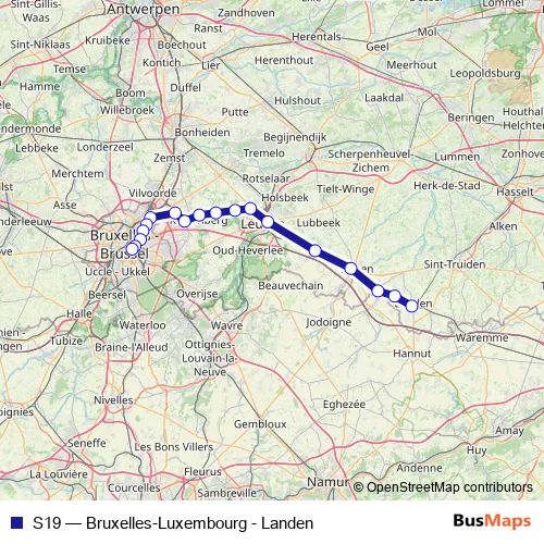 The first stop of the S19 rail route is Landen and the last stop is Brux./Brus.-Luxemb.. S19 (Bruxelles-Luxembourg - Landen) is operational during on weekends.