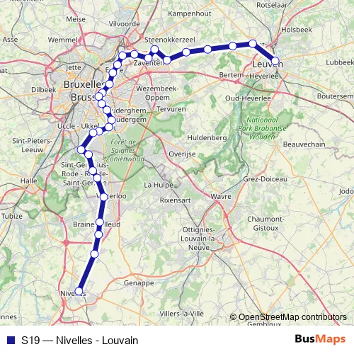 The first stop of the S19 rail route is Louvain / Leuven and the last stop is Nivelles / Nijvel. S19 (Nivelles - Louvain) is operational during on weekends.
