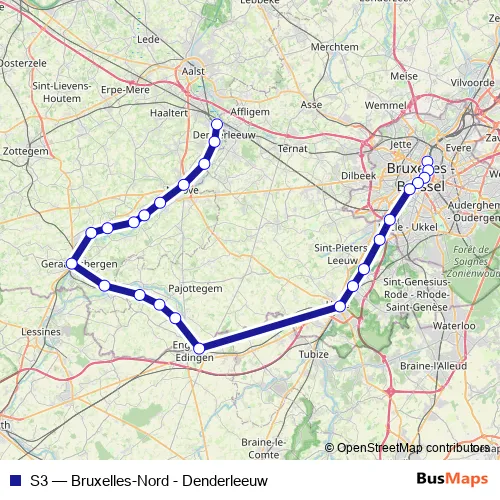 The first stop of the S3 rail route is Brux.-Nord/Brus.-Noord and the last stop is Denderleeuw. S3 (Bruxelles-Nord - Denderleeuw) is operational during everyday.
