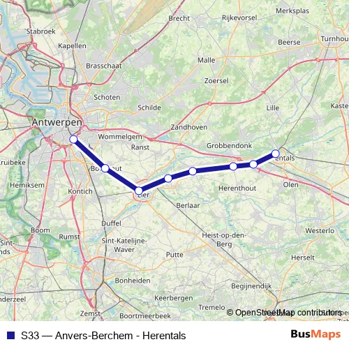 The first stop of the S33 rail route is Herentals and the last stop is Anvers-Berchem / Antwerpen-Berchem. S33 (Anvers-Berchem - Herentals) is operational during on weekdays.