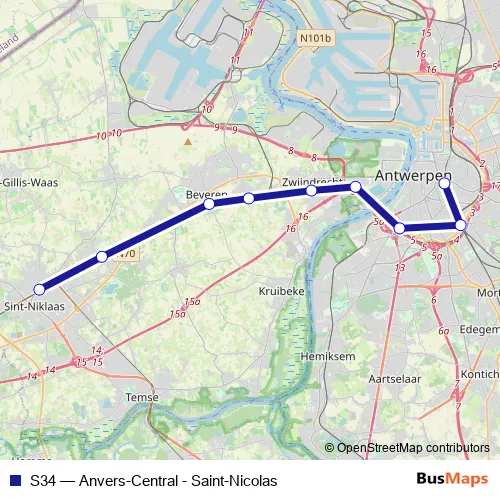 The first stop of the S34 rail route is Anvers-Berchem / Antwerpen-Berchem and the last stop is Saint-Nicolas / Sint-Niklaas. S34 (Anvers-Central - Saint-Nicolas) is operational during on weekdays.