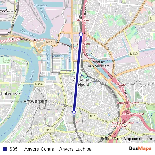 The first stop of the S35 rail route is Anvers-Luchtbal / Antwerpen-Luchtbal and the last stop is Anvers-Central / Antwerpen-Centraal. S35 (Anvers-Central - Anvers-Luchtbal) is operational during everyday.