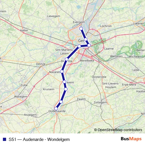 The first stop of the S51 rail route is Wondelgem and the last stop is Audenarde / Oudenaarde. S51 (Audenarde - Wondelgem) is operational during on weekends.