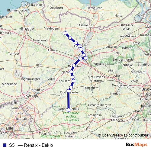 The first stop of the S51 rail route is Renaix / Ronse and the last stop is Eeklo. S51 (Renaix - Eeklo) is operational during everyday.