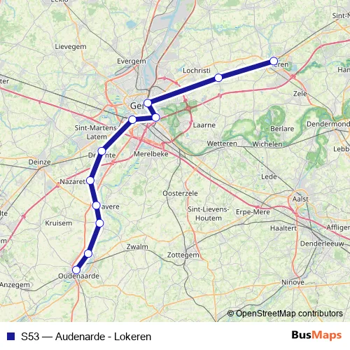 The first stop of the S53 rail route is Lokeren and the last stop is Audenarde / Oudenaarde. S53 (Audenarde - Lokeren) is operational during on weekdays.