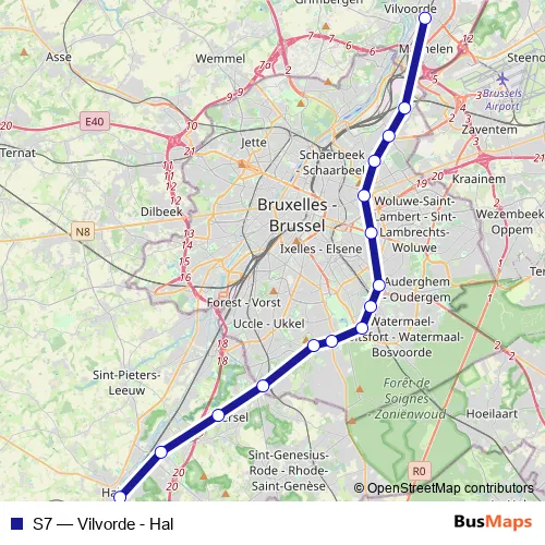 The first stop of the S7 rail route is Hal / Halle and the last stop is Vilvorde / Vilvoorde. S7 (Vilvorde - Hal) is operational during on weekdays.