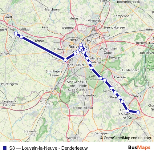 The first stop of the S8 rail route is Denderleeuw and the last stop is Louvain-la-Neuve. S8 (Louvain-la-Neuve - Denderleeuw) is operational during on weekdays.