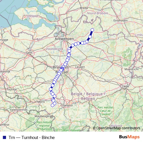 The first stop of the Trn rail route is Turnhout and the last stop is Binche. Trn (Turnhout - Binche) is operational during everyday.