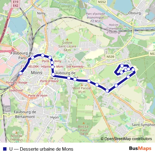 The first stop of the U bus route is Mons Epinlieu and the last stop is Mons Sncb - Quai A. U (Desserte urbaine de Mons) is operational during on weekdays.