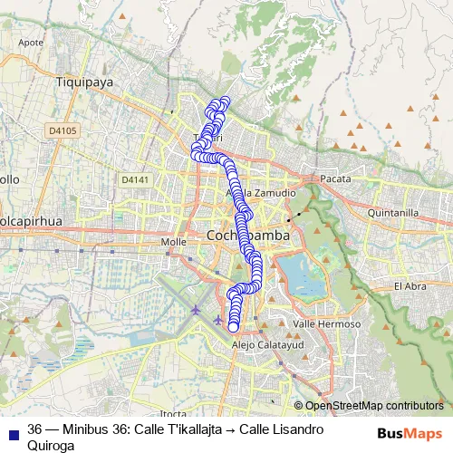 The first stop of the 36 bus route is Calle T'ikallajta and the last stop is Calle Manuel Virreira. 36 (Minibus 36: Calle T'ikallajta → Calle Lisandro Quiroga) is operational during everyday.
