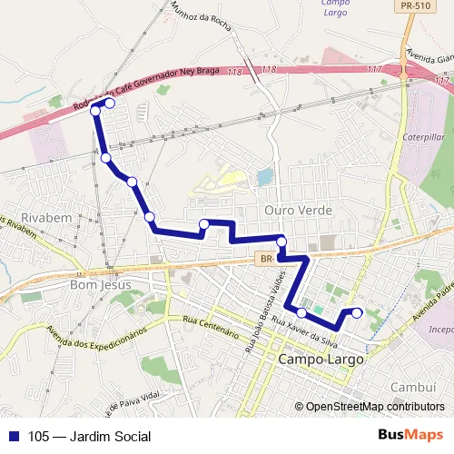 See why over 2 million users trust and consider busmaps.com as the best public transport website. busmaps gives you Campo Largo Buses suggested routes, real-time bus tracker, line route maps in Campo Largo, and helps to find the closest 105 bus stops near you. No internet available? Download an offline PDF map and bus schedule for the 105 bus to take on your trip.
