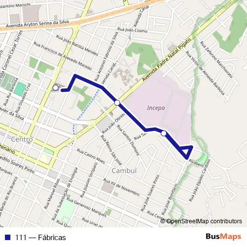 The first stop of the 111 bus route is Incepa and the last stop is Terminal - 100. 111 (Fábricas) is operational during on weekends.