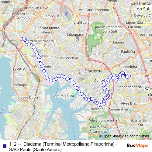The first stop of the 112 bus route is Av. Encarnacao 482 - Piraporinha Diadema - SP 09960-010 Brasil and the last stop is Rua Desembargador Bandeira de Mello 392 - Santo Amaro Sao Paulo - SP 04743-001 Brasil. 112 (Diadema (Terminal Metropolitano Piraporinha) - SAO Paulo (Santo Amaro)) is operational during everyday.