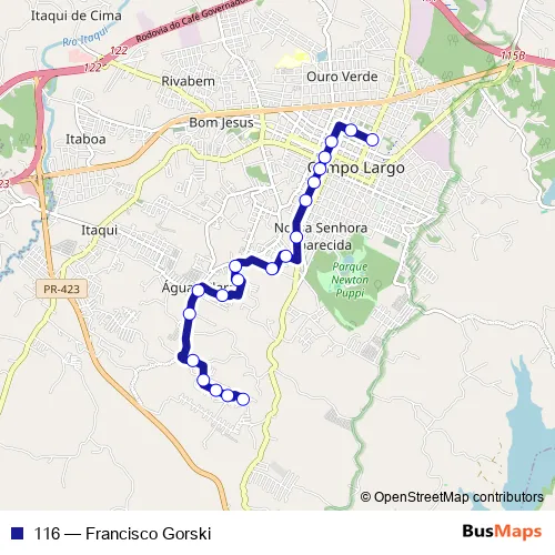 See why over 2 million users trust and consider busmaps.com as the best public transport website. busmaps gives you Campo Largo Buses suggested routes, real-time bus tracker, line route maps in Campo Largo, and helps to find the closest 116 bus stops near you. No internet available? Download an offline PDF map and bus schedule for the 116 bus to take on your trip.